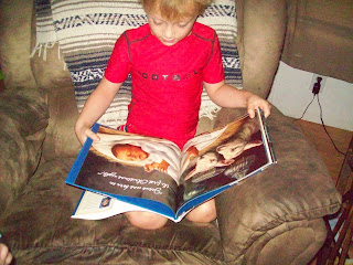 Above you see Brinner amazed at the beautifully drawn picture of baby Jesus. This books is full of lovely rhyming words that tell the story is a special sounding way. The pages are not too long so it holds the child's attention just perfectly.