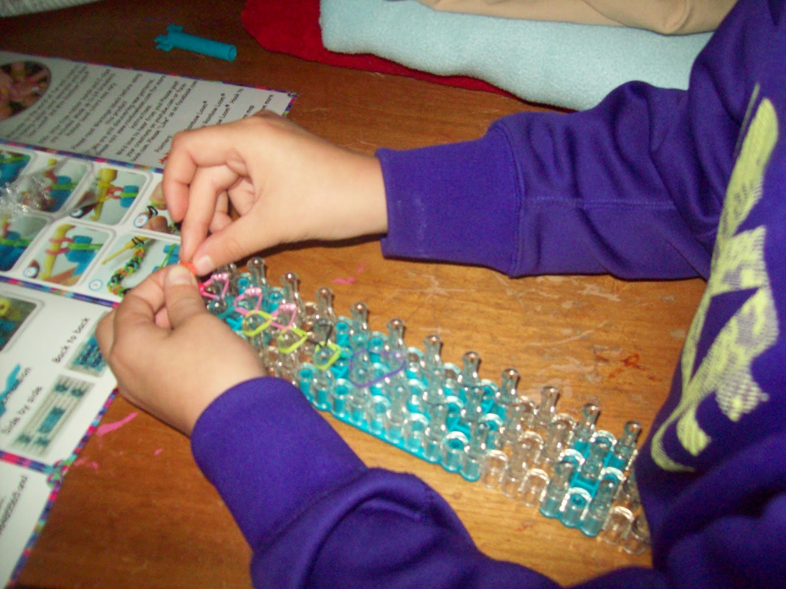 Here you see Brice making some multi colored bracelets in his school colors. He is making these without the use of the loom by using his fingers. We didn't have the loom when he began making them but when it came in he really liked using it better.